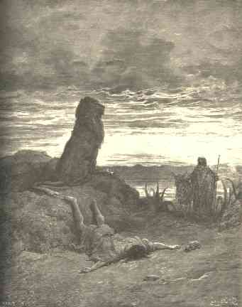 24 | And when he was gone, a lion met him by the way, and slew him: and his carcass was cast in the way, and the ass stood by it, the lion also stood by the carcass.