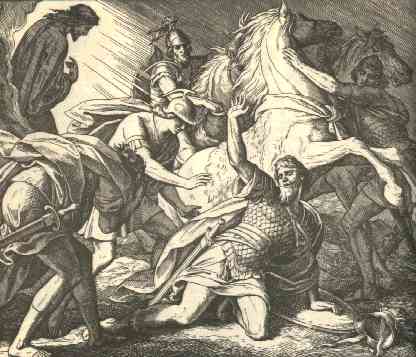 8 | And Saul arose from the earth; and when his eyes were opened, he saw no man: but they led him by the hand, and brought him into Damascus. |
