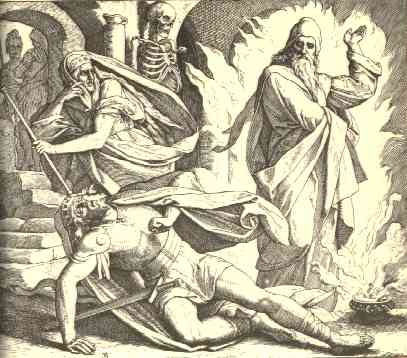 14 | And he said unto her, What form is he of? And she said, An old man cometh up; and he is covered with a mantle. And Saul perceived that it was Samuel, and he stooped with his face to the ground, and bowed himself. |